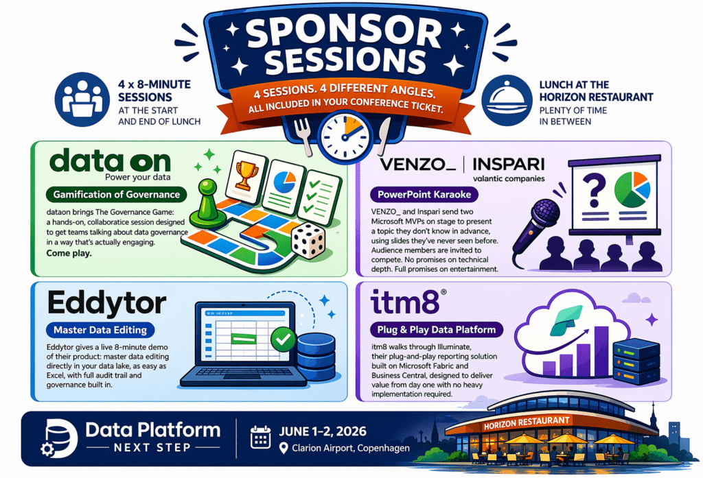 We’ve extended the lunch break from 60 to 75 minutes – and we’re using that extra time to introduce a new format: sponsor sessions. Four sessions, 8 minutes each, delivered by the companies behind some of the most interesting tools and approaches in the data platform space right now.